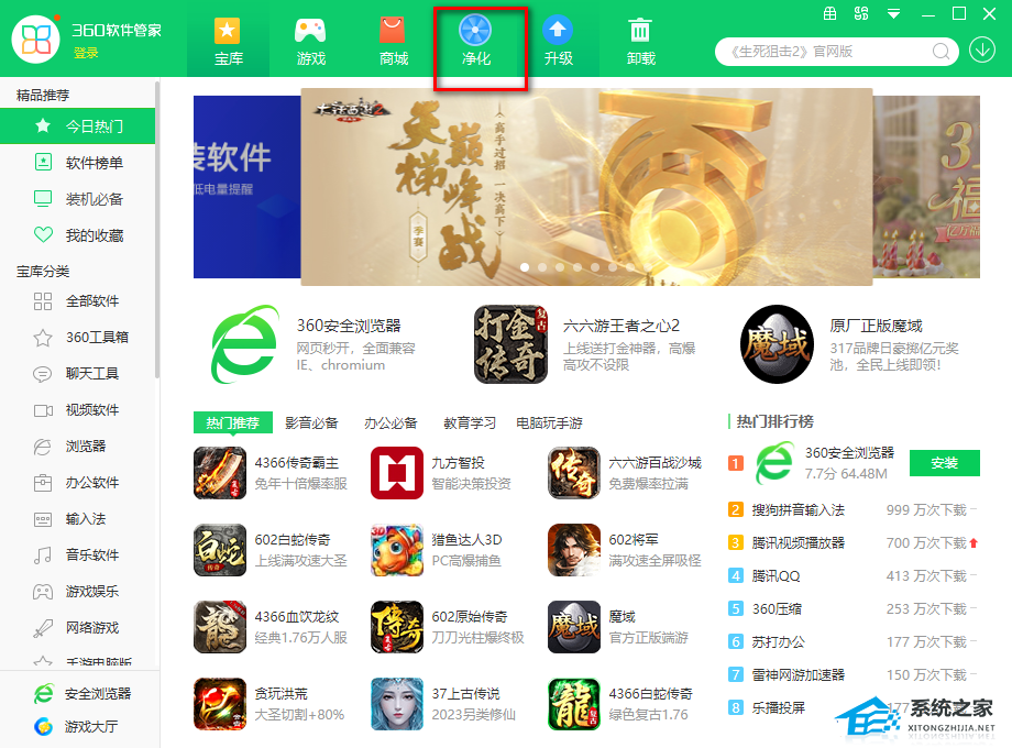 2、之后进入到360软件管家的页面中,然后在该页面的上方有一个【净化】的功能选项,将该功能选项点击打开。
