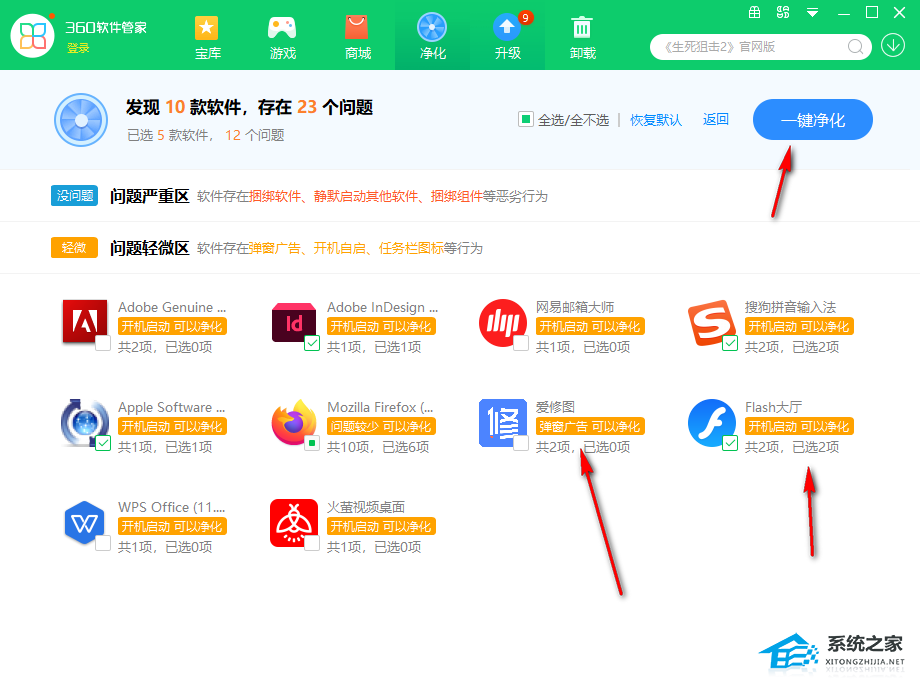 5、当扫描完成之后,会查看到页面上出现很多有问题的软件,有弹窗广告的软件,有开机启动的软件等,那么我们直接点击右上角的【一键净化】按钮即可。