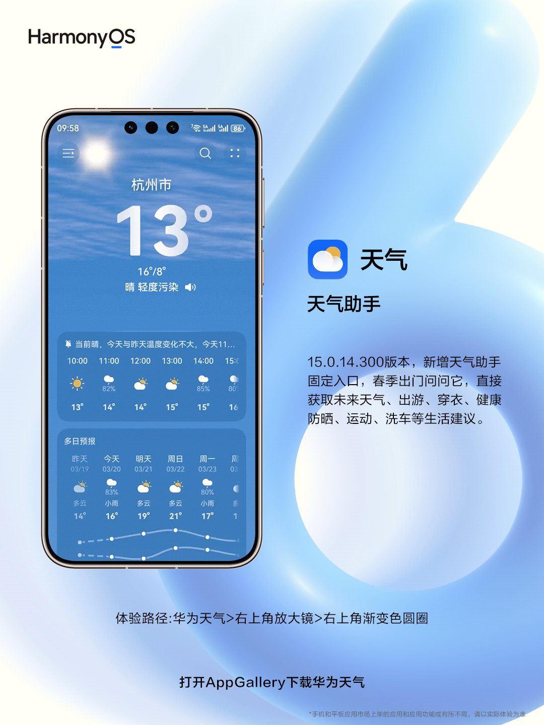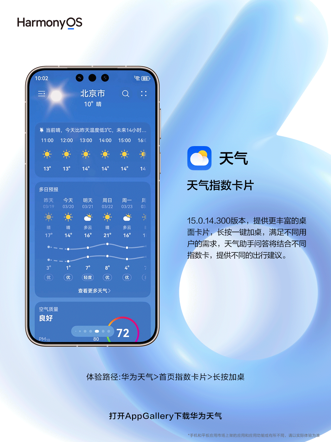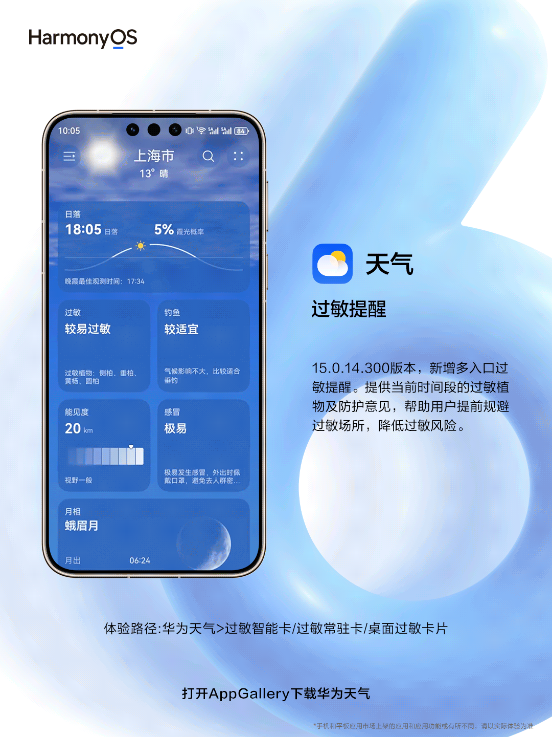 华为天气 15.0.14.300 版本还新增过敏提醒多入口覆盖,可辅助用户提前规避过敏风险;新增天气助手固定入口,支持 24 小时气象专家答疑;天气指数卡片支持一键添加至桌面,提供穿衣防晒等生活建议智能推送。